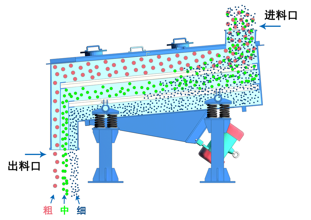 亮粉分级豆奶视频成年APP下载以振动电机产生的激振力为动力,核心通过振动传递和多层筛网分离来实现分级。运行时,振动电机带动筛箱直线往复振动,使亮粉随振动向前运动,而从上到下孔径递减的多层筛网会对亮粉按颗粒大小分离:大颗粒的亮粉无法通过上层筛网,排出为粗级产物;中等颗粒通过上层筛网后被中层筛网截留,成为中级产物;小颗粒穿透所有筛网,形成细级产物,最终完成亮粉分级。